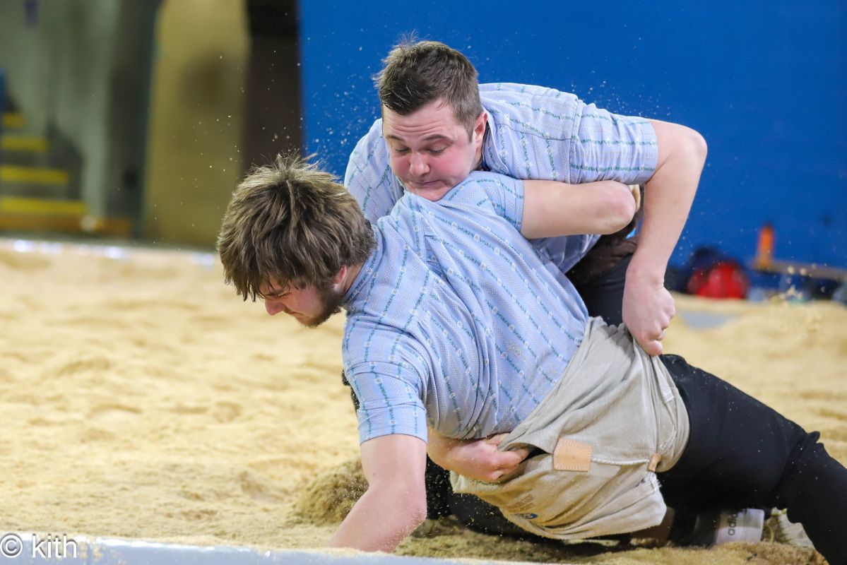 Der Schlussgang zwischen den beiden Eidgenossen Marcel Räbsamen und Nick Alpiger endet nach 10 Minuten gestellt. Dennoch darf sich Marcel Räbsamen als Sieger des 128. Berchtold Schwingets feiern lassen. Der Schwingklub Zürich bedankt sich bei 1300 Zuschauern.