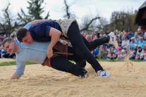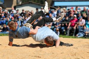 Sehr viele Zuschauer genossen das schöne und warme Frühlingswetter in Zäziwil mit spannenden Gängen und guter Festwirtschaft. Der Schlussgang gewinnt der Einheimische Michael Moser nach nur 59 Sekunden mit Innerem Hacken und Nachdrücken gegen den Truber Thomas Wüthrich.