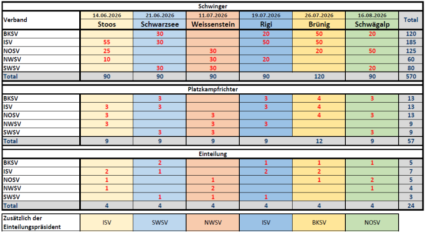 Verteiler Schwinger und Kampfrichter am Kilchberger 2026 Ebenso wurden die Anzahl Schwinger und Kampfrichter pro Teilverband für das Kilchberger 2026, auch hier wie von der TK ESV vorgeschlagen, bestimmt.