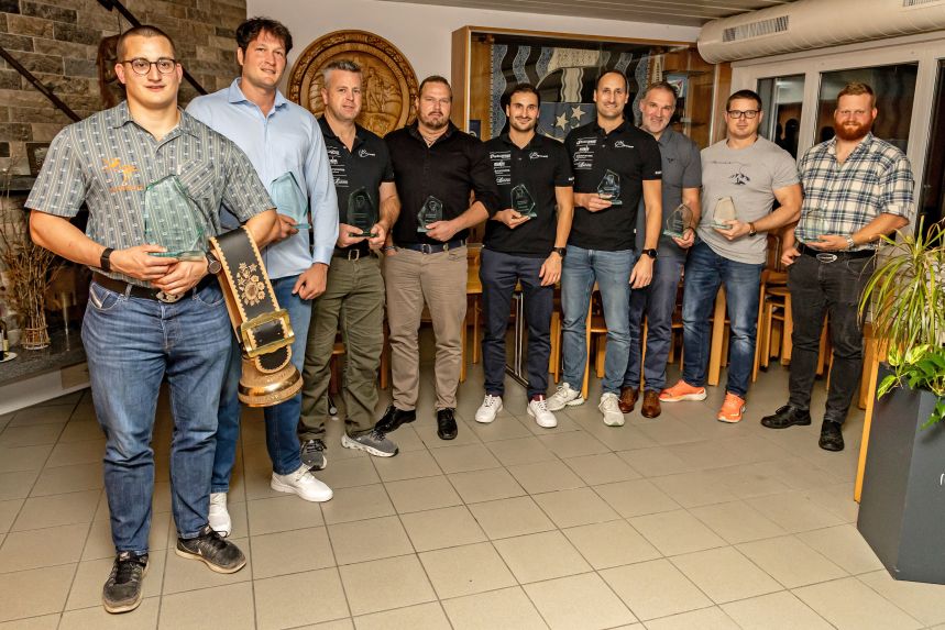 Zum dritten Mal setzte die Steinstossfamilie mit dem Schlussevent in der Schützenstube Buchs AG einen Punkt hinter die abgelaufene Saison. Im Mittelpunkt stand wiederum das Rangverlesen der Jahreswertung mit Dominator Urs Hutmacher und zwei weiteren speziellen Athleten auf dem Podest. 39 Steinstösser und Angehörige feierten im aargauischen Buchs das Saisonende mit einem stimmungsvollen Abend bei Speis’ und Trank sowie angeregten Gesprächen. Roland Stählin, Mitglied der Arbeitsgruppe Steinstossen und national bekannter Speaker, verhehlte in seinem Rückblick auf die 20 Wettkämpfe der Jahreswertung nicht, dass organisatorisch nicht alle Veranstalter die gestiegenen Anforderungen erfüllten. Nicht davon betroffen waren die beiden Saisonhöhepunkte, das Steinstossen im Rahmen des Eidgenössischen Schwing- und Älplerfestes (ESAF) in Mollis und die Schweizer Meisterschaften in Reichenbach. Ein Dominator, 12'000 km und «Hunzik grausam» Zum dritten Mal in Serie gewann der Zürcher Oberländer Urs Hutmacher die Jahreswertung Steinstossen in überragender Manier. Der 31-jährige Informatikspezialist gewann 33 von 35 absolvierten Einsätzen. Zweimal musste er sich mit Rang 2 begnügen, geschlagen von Mauro Betschart (mit dem Unspunnenstein am ESAF) und von Benedikt Büchenbacher (mit dem 20-kg-Stein am Fricktaler Abendschwinget). Dahinter taucht in diesem Jahr ein fast neuer Name auf. Flavio De Benedetto brachte in seinem erst zweiten Jahr als Steinstösser das Kunststück fertig, sich auf Rang 2 zu etablieren. Der 34 Jahre alte Genfer verriet in Buchs, dass er für die Teilnahme an allen möglichen Wettkämpfen nicht weniger als 12'000 km mit dem Auto gefahren sei. Ebenfalls eine Charakterfigur ist der Gewinner des dritten Glasawards. Simon Hunziker erreichte zum dritten Mal hintereinander Platz 3 in der Jahreswertung. Der Fricktaler ist mit 43 Jahren aktuell der älteste Spitzenstösser des Landes. Dass hinter ihm die Gebrüder Roger und Marco Leimgruber die Gesamtränge 5 und 6 belegen, ist als Trainingsleiter des Turnvereins Herznach auch ein Verdienst von «Hunzi grausam», wie ihn die Sportkollegen nennen. Zufriedener Martin Jakober auf Rang 4 Ebenfalls eine positive Saisonbilanz zog der viertklassierte Martin Jakober, obwohl er gegenüber dem Vorjahr um zwei Positionen zurückfiel. Der 40-jährige Obwaldner ist Spezialist mit den schweren Steinen sowie Wettkämpfen aus Stand. «Ich habe in dieser Saison mit allen Steinen neue persönliche Bestweite gestossen. Dazu habe ich mein Hauptziel der Saison, den ESAF-Final mit dem Unspunnenstein, erreicht», resümierte der Routinier beim Schlussevent zufrieden. Wie sehr er das Steinstossen liebt, zeigt sein finanzielles Engagement mit seiner Einzelfirma als Sponsor der Jahreswertung Steinstossen.