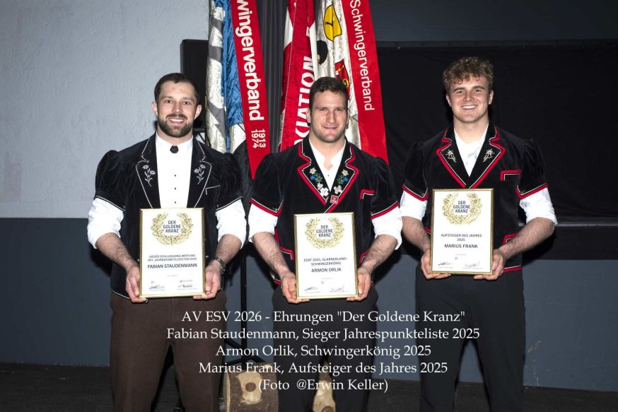 Ehrungen Geehrt wurden folgende Schwinger: • Schwingerkönig ESAF 2025 Glarnerland+ Armon Orlik, NOSV • Sieger SCHLUSSGANG-Wertung, offizielle Jahrespunkteliste des ESV Fabian Staudenmann, BKSV • Aufsteiger des Jahres 2025 Marius Frank, NWSV